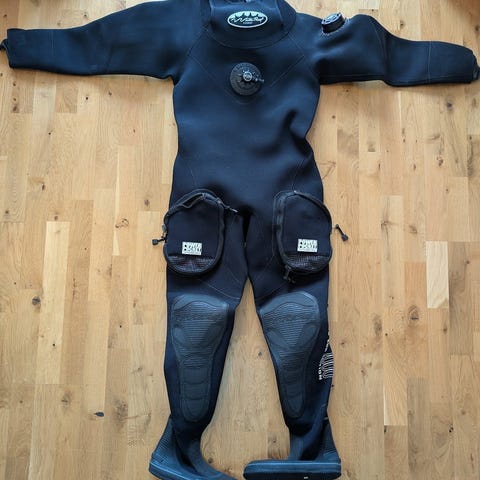 Då jag inte längre dyker så gör jag mig av med min torrdräkt med tillhörande fodrad overall samt ett viktbälte på 10kg.