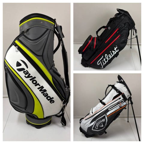 Till det medföljer en rikigt snyggt och sparsamt använd bärbar bag med stödben av märket TaylorMade.