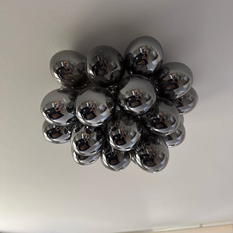 Säljer en By Rydéns Gross taklampa av runda glassbollar i färgen rökgrå