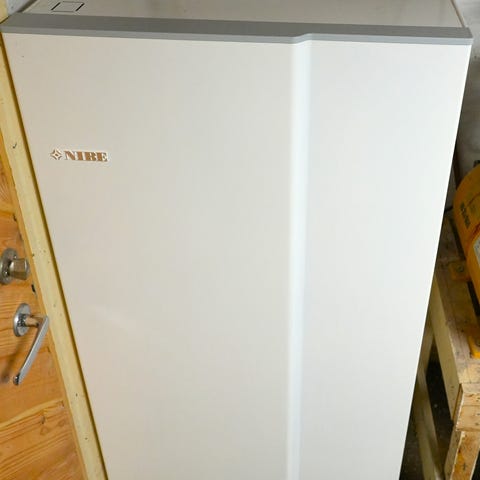 Nibe ERS-R 300 / Compact 300-R 3kW ventilations-/frånluftsaggregat i vit plåtskåpmodell. Har tydlig märkplåt med specifikationer och står som fristående enhet redo att kopplas in i befintligt system.