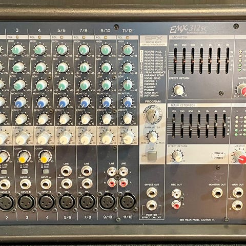 Behringer Eurorack MX 2004A mixerbord med 20 kanaler, reglar och rattar för nivå, EQ och panorering. Har både XLR- och line-ingångar samt utgångar på ovansidan för enkel inkoppling.