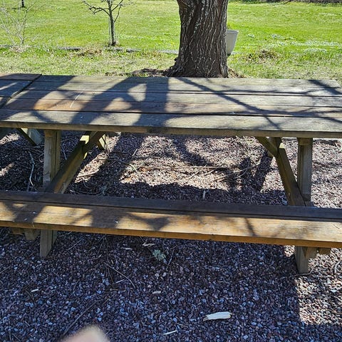 Bord med bänkar, metallstativ. Stadigt. Bra skick. Mindre storlek, passar barn i yngre skolålder.