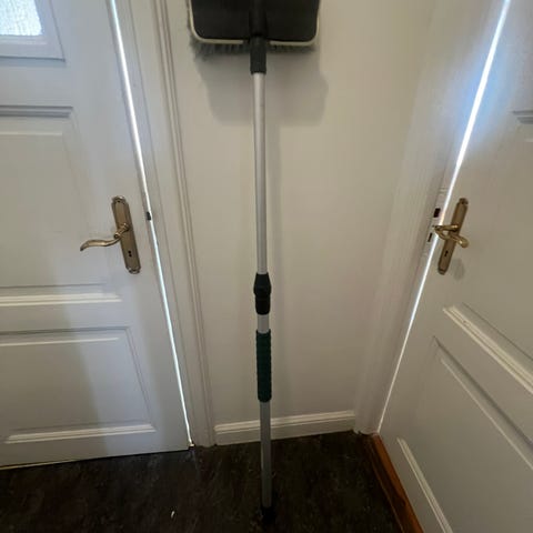 Tvättborst med teleskopskaft och mjuka borst, bra för att komma åt högre ytor. Har greppvänliga handtag och anslutning för vattenslang uppe vid skaftet. Av och på knapp
