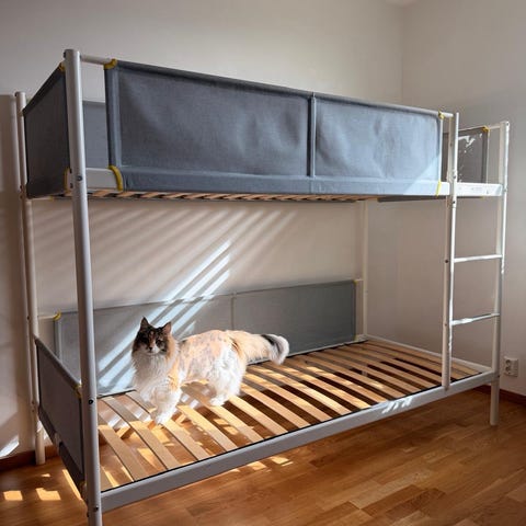 Våningssäng från IKEA i trä med stege på sidan, valfritt vilken sidan som stegen ska vara på.