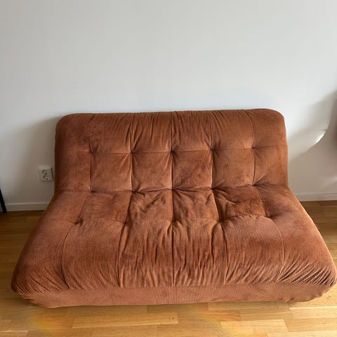 Futonliknande soffa som kan fällas till en bädd i lila plysch