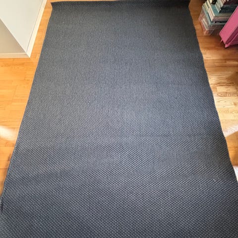 Grå MORUM-matta från IKEA i storlek 200x300 cm. Plattvävd modell som ligger stadigt på golvet och har diskret mönster i väven.