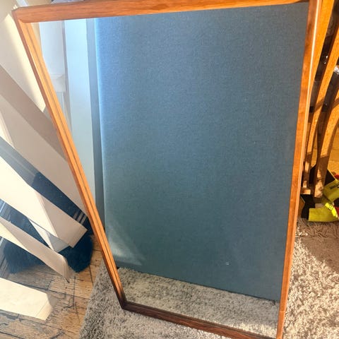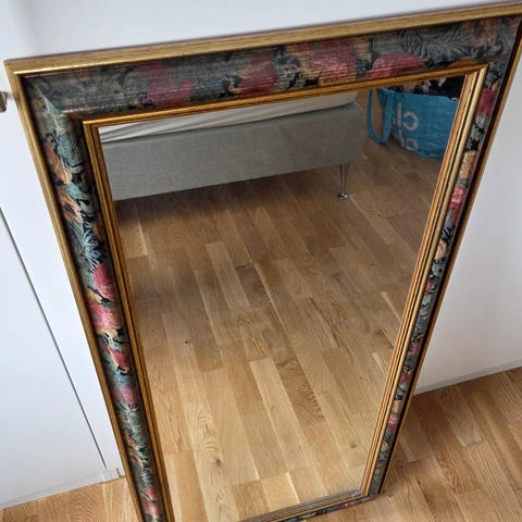 Oval spegel från G&T med blå ram (teak under, hemmålad). Baksidan har originaletikett och spegeln har upphängning så den är lätt att sätta på väggen.