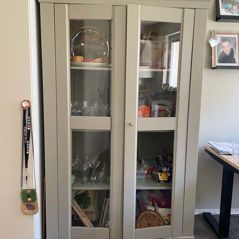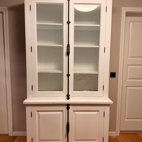 Ett ommålat bastant skåp med glas på övre delen. Skåpet är målat grått med en charmig finish. Skåpet har hyllplan och kan användas både som garderob eller vitrinskåp. Skåpets kom för några år sedan till Sverige från en auktion i Köpenhamn.