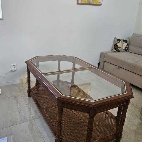 Fint sidobord med glasbordsskiva och träram runt kanten. Stadiga svarta metallben med svängda detaljer ger ett lätt och luftigt intryck.Tidlöst och lätt att matcha.