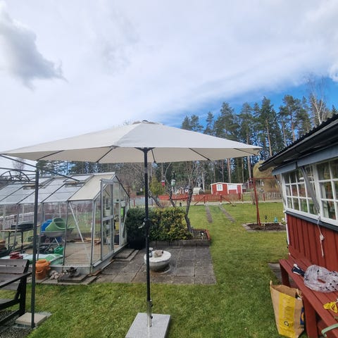 Stort och fyrkantigt frihängande parasoll som tack vare sitt smarta stativ kan stå vid sidan och ändå ge skugga på rätt plats. Det är enkelt att fälla upp och ner med ett handgrepp. Parasollet är 300x300 cm stort. Vitt parasoll, smutsigt och hål på några platser, se bilder. Har köpt ett lagningskit som medföljer om så önskas. Nypris 3995 kronor.
