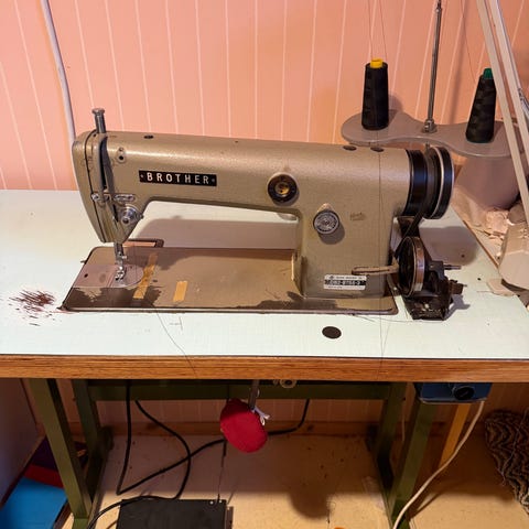 Drivs 220w nu,,från en stark Mycket stark motor,klarar symaskin all. Material även flera lager,,