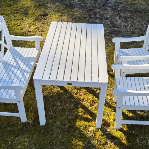 Vitt trädgårdsbord i trä med fyra matchande positionsstolar, alla med ribbad sits och rygg. Bordet har 2 iläggsskivor och stolarna har armstöd och justerbar rygg.