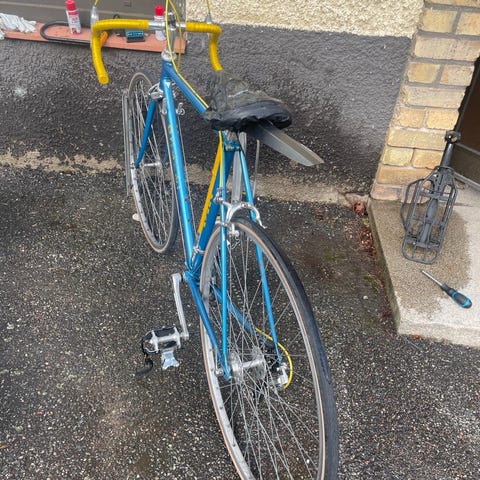 DBS herrcykel med 28" hjul och ramstorlek L, blå med kedjeskydd och pakethållare bak. Utrustad med framlampa, reflexer och skärmar både fram och bak.