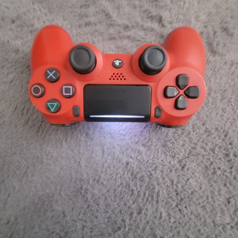 Vit DualShock 4 handkontroll till Playstation 4. Har inbyggd touchpad, styrspakar och vanliga knappar som syns på bilden.