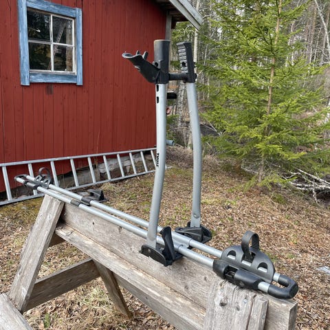 Cykelställ för bil med bågar och spännband som fästs runt bakluckan. Har flera hållare för cyklar och justerbara remmar för att spänna fast ordentligt.