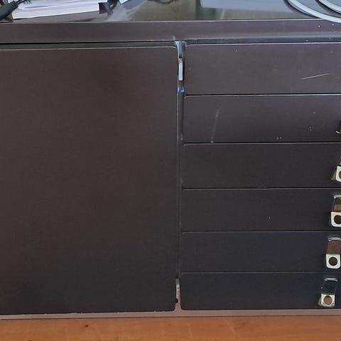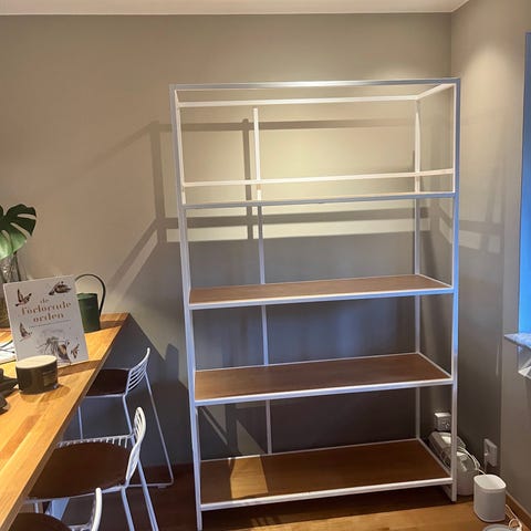 En hylla som var högsta mode på 1970-talet. Italiensk design. Tillverkad i Sverige. Hyllan består av två sektioner: en på 201 cm och en på 90 cm. Komplett manual finns. Måste demonteras på plats i Skövde.