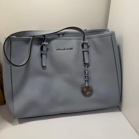 Grå shopperväska i läder från Michael Kors med kedjedetaljer på handtagen. Invändigt finns flera fack och dragkedja för att hålla ordning på sakerna.