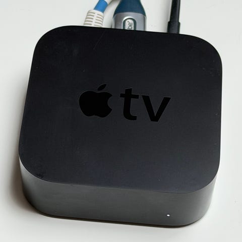 Säljer en svart Apple TV HD med original fjärrkontroll (Siri Remote) och strömkabel.