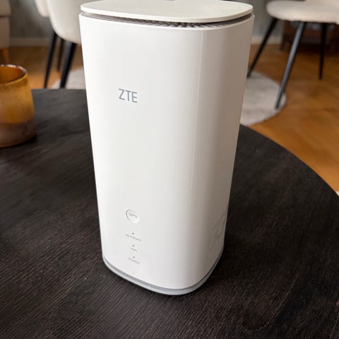 Zyxel NR5103E 5G NR Indoor Router med WiFi 6, står stadigt i ett vitt hölje med svart topp. Har knapp på framsidan och flera portar på baksidan för nätverkskablar.