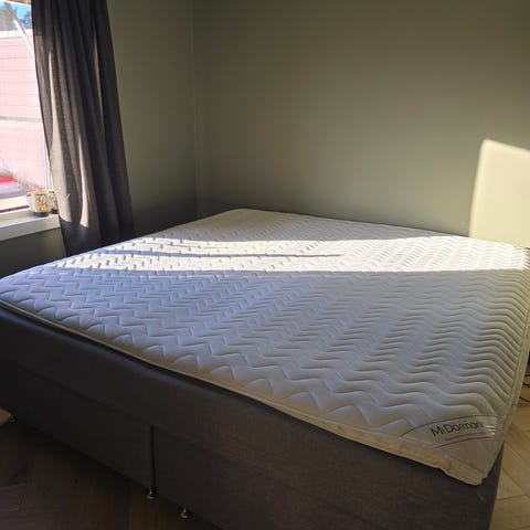Kontinentalsäng från Mio med hög, knapptuftad gavel i grått tyg. Står på metallben och har övermadrass ovanpå.