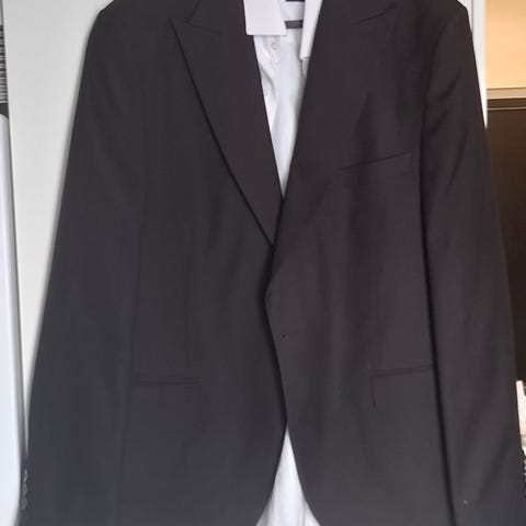 Använd 2 gånger, köpt maj 2024. Svart kostym från Dressmann i polyester, kavaj stl 48 och byxor med mått 33-30. Kavajen har slag med enkel knäppning och fickor fram, byxorna har hällor för skärp. Pris kan diskuteras.