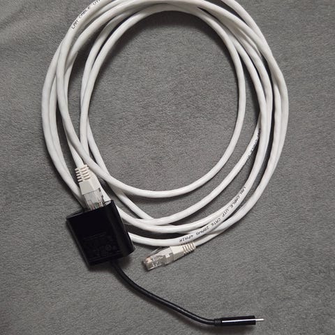 Två små nätverksadaptrar, en från Uni med USB-C och en vit med USB-kontakt. Båda har nätverksport (RJ45) i andra änden och korta flexibla kablar. 100kr each