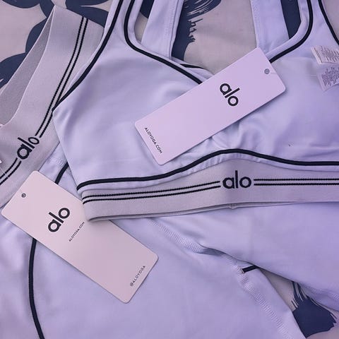 Svart träning set från Alo i stl S, sport-bh och tights med vita kontrastsömmar. Mjukt stretchigt material och bred resår med Alo-logga.