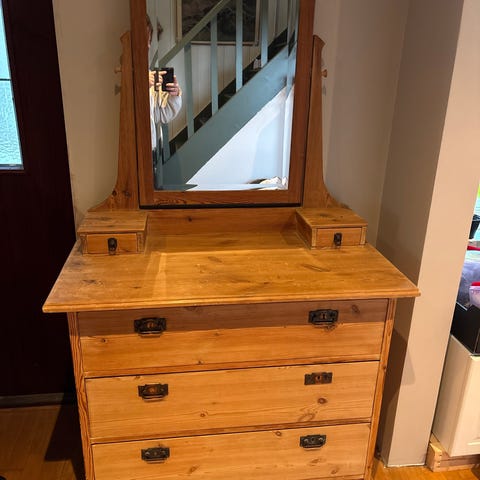 Stabil och gedigen möbel med fin patina och normalt åldersslitage. Lådorna är rymliga och byrån står stadigt.