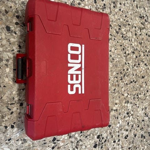 Paslode spikpistol i orange plastväska med formgjutet innerskal. Med följer gasflaska, laddare, kabel och extra panelnos som syns på bilderna.