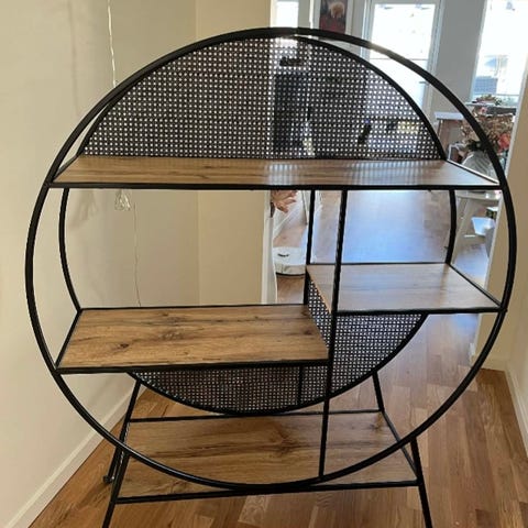Vit metallvägghylla med flera hyllplan i olika nivåer. Fästs enkelt på väggen med de inbyggda upphängningsbeslagen upptill.