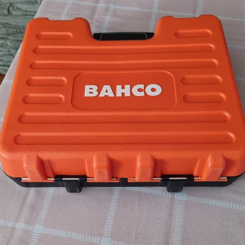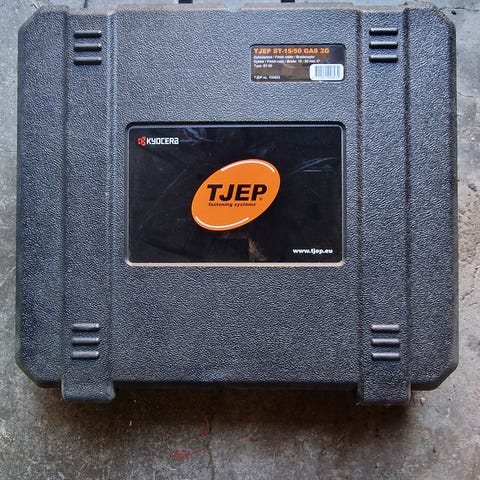 Senco spikpistol i röd plastväska med formgjutet innerskal. Batteri och laddare följer med i väskan samt manual i locket.