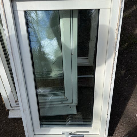 Vitt fönster med mått 480 x 930 mm, öppningsbart med handtag på sidan. Har frostat glas och vit karm runt om.
