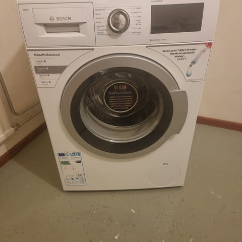 LG kombinerad tvättmaskin/torktumlare med stor frontlucka. Enkel panel upptill och vit design som passar in i de flesta badrum och tvättstugor.