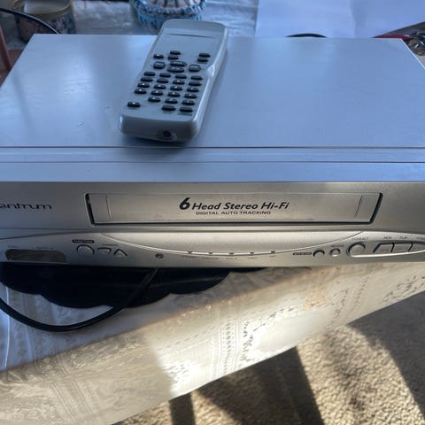 Radionette RN-100 videobandspelare. Modellnummer RN-100. Tillverkad i Indonesien. Spelar NTSC-format. Har funktioner för lång uppspelning och inspelning, enkel grafisk meny och Video Doctor.