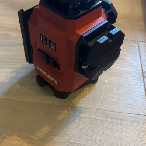 Hilti PM 4-M korslaser med röda starka laserlinjer åt båda håll samtidigt . Står stadigt på ben och har mutterfästen för att fästa i stativ.
