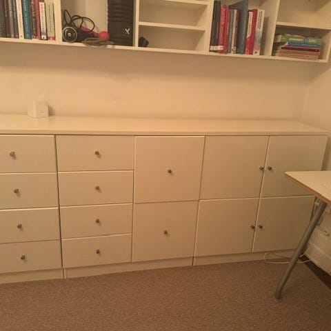 IKEA vit förvaringsvägg med vitrindelar och lådor