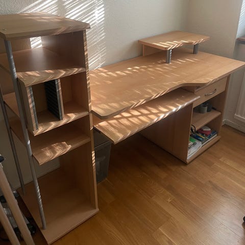 Ett praktiskt hörnskrivbord med mycket förvaring. Det går att justera hyllplan samt att bygga till fler delar för eget tycke. Det är välanvändt och har skönhets defekter, men inget som påverkar funktionen och det har mycket kvar att ge!
