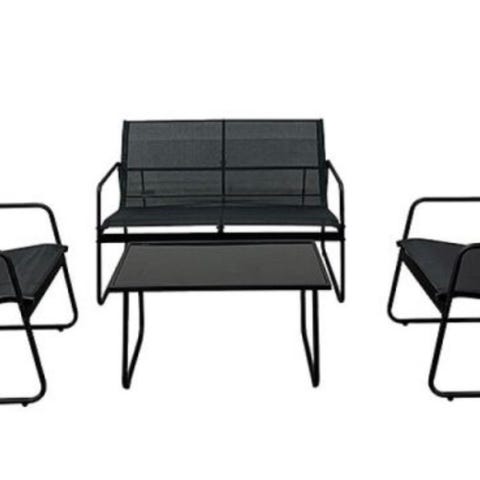 Litet caféset med runt bord och två stolar i metall och flätad sits/rygg. Smidigt set som tar liten plats på altan eller balkong.