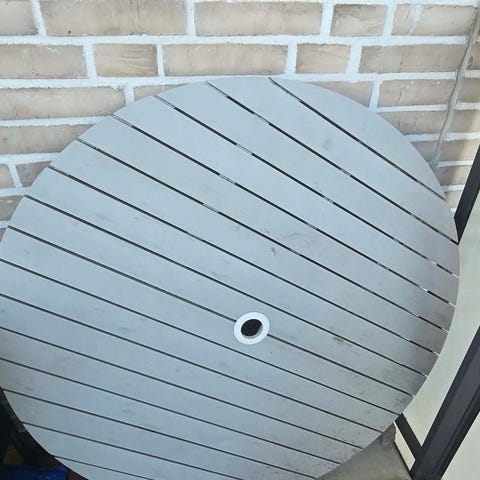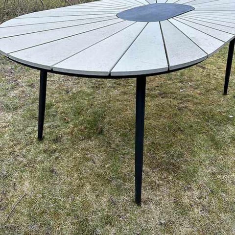 Runt utebord med vit stomme och grå skiva. Stadigt bord som passar bra på uteplatsen.