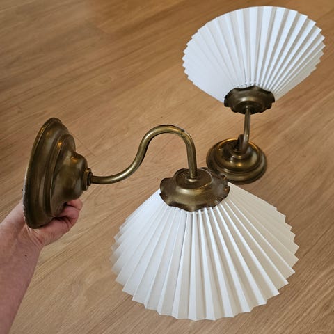Säljer ett par (två stycken) dekorativa vägglampor i klassisk stil med böjd arm i mässing. Ger ett varmt och stämningsfullt ljus – perfekt som sänglampa, i hallen eller vardagsrummet.