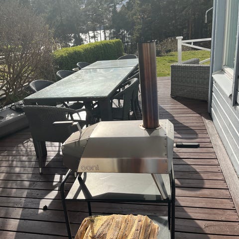 Ooni pizzaugn i svart med pizzasten och ben i metall. Har öppning fram för pizzaspade och står smidigt på ett bord eller hylla på uteplatsen.