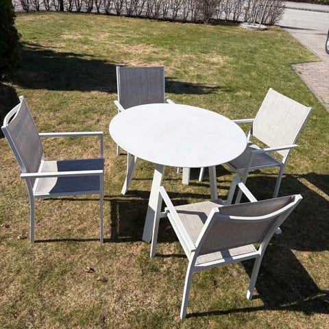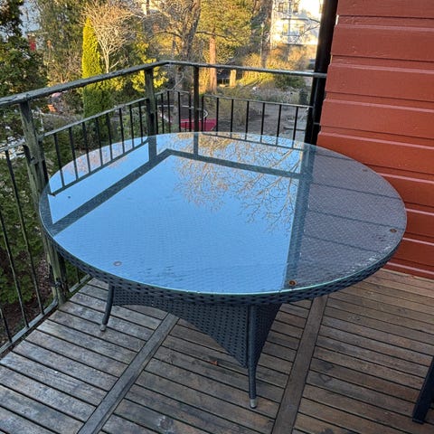 Bordet har glasskiva och stolarna har armstöd och smala ben med metallfötter.