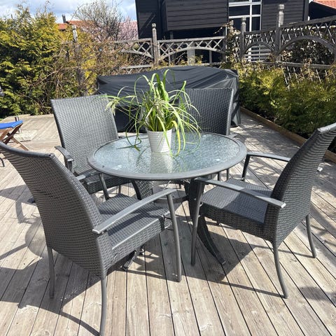 Svart runt utebord 160 cm med 4 stolar i konstrotting