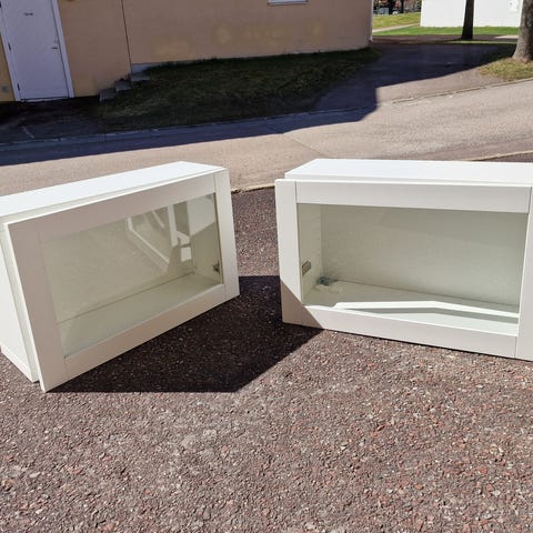 3 Faktum väggskåp från IKEA med 3 glasskivor som hyllplan. 1 glasdörr, 2 dörrar som vitmålats, Passar även bra som öppen förvaring.