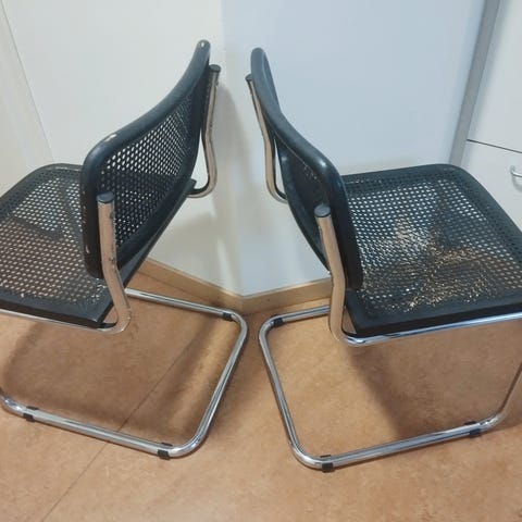 Säljer två svarta Bauhaus-stolar med armstöd. Är i använt skick och vi har lagat de två sitsarna en gång, nu är dom dock i behov av en ny lagning (går ganska enkelt att göra själv). Ryggdelen har också mindre hål i rottingen, men inget som påverkar funktionen. Finns en del skönhetsfläckar och märken på armstöd och karmar. Plastplupparna undertill kan också behöva bytas ut.