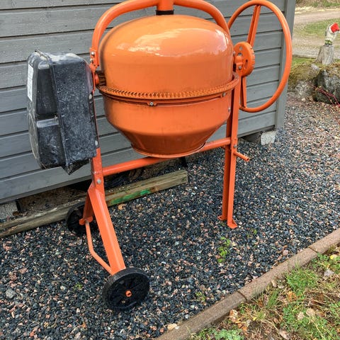 Stark cementblandare på stativ med två hjul och handtag för att tippa trumman. Elmotor på sidan med skyddskåpa och enkel ramkonstruktion som är lätt att flytta runt på tomten.