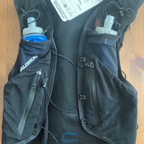 Svart löparväst från Salomon, modell Adv Skin 5 i storlek L. Flera fack fram och bak samt justerbara remmar för bra passform.