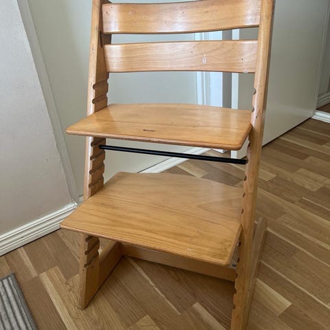 Stokke Tripp Trapp matstol i lackat trä i natur. Klassisk justerbar stol där både sits och fotstöd går att flytta i höjdled. Mycket bra kvalitet!