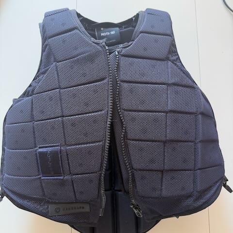 Racesafe RS2010 säkerhetsväst för barn säljes. Den är svart med dragkedja fram och snörning i sidorna, storlek M. Mjuka vita skyddspaneler på insidan som täcker hela ryggen och sidorna.