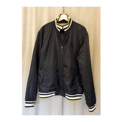 Svart med vita detaljer och läderimmiterade ärmar. Köpt till sonen som inte tyckte om den och hann inte returnera den i tid. Har nu bara hängt i hans garderob orörd.